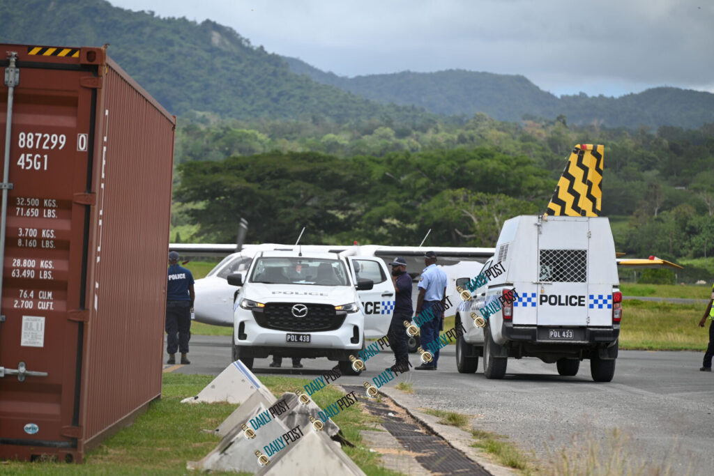 The convoy, led by three police motorcycles, left the airport and passed through a gate at the corner of the Airports Vanuatu Limited building to access the main road leading to UNELCO’s premises in Tagabe.
